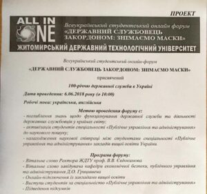 06.06.2018 року відбувся всеукраїнський студентський онлайн форум «Державний службовець закордоном: знімаємо маски» присвячений 100-річчю державної служби України. Форум був організований Житомирським державним технологічним університетом. Студенти п’ятого курсу групи МПМп-171 спеціальності «Менеджмент» прийняли активну участь у цьому заході.